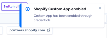 If the integration was enabled successfully, the Shopify Custom App enabled message is displayed at the top right: